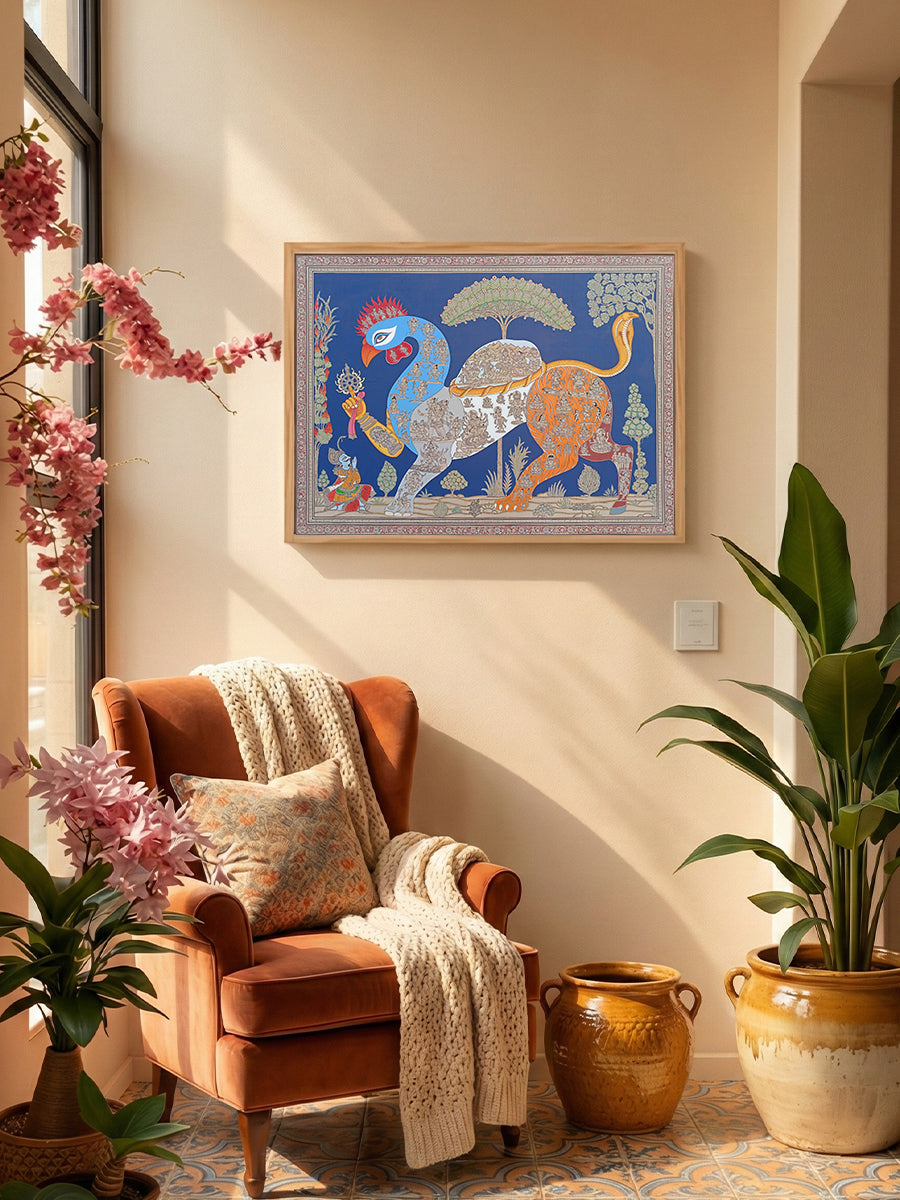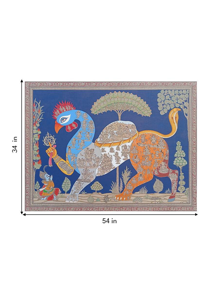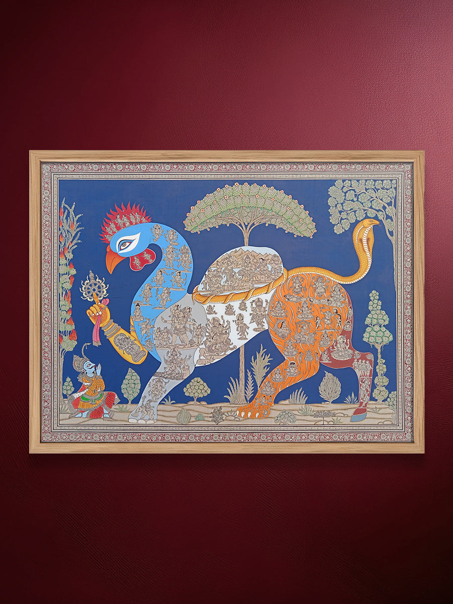 This Pattachitra painting depicts Navagunjara, the extraordinary composite form revealed to Arjuna in the Mahabharata, symbolising the unity of multiple beings within the divine. Navagunjara is composed of nine creatures—a rooster’s head, peacock’s neck, bull’s hump, lion’s waist, deer’s back, elephant’s trunk, tiger’s claws, human leg, and serpent’s tail—all seamlessly merged into a single cosmic body. In this rendering, each segment of the body becomes a narrative surface, densely populated with finely drawn miniature figures of gods, attendants, warriors, ascetics, and mythological episodes, transforming the form into a moving universe of stories.