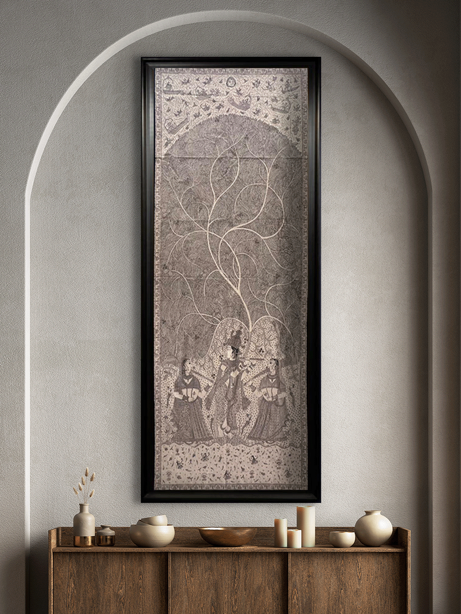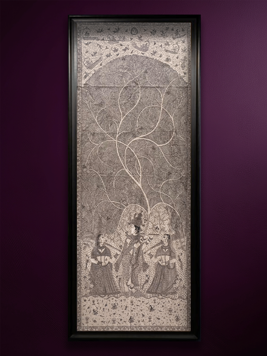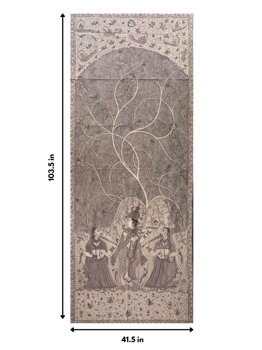This striking textile is a contemporary, monochrome interpretation of Mata ni Pachedi by the acclaimed artist Sanjay Chittara, incorporating the unique narrative of Lord Krishna with his consorts, Radha and Rukmini, beneath the symbolic Tree of Life. Mata ni Pachedi is a traditional sacred cloth painting from Gujarat, executed here with a stunning focus on linework, utilizing only black pigment (derived from oxidized iron) on natural cotton cloth, which highlights the artist's meticulous kalam work. The composition is dominated by the colossal Tree of Life, whose intricate, densely drawn foliage and gently arching white branches fill the background, symbolizing cosmic harmony and interconnectedness. At the base of the tree are the principal figures: Lord Krishna, easily identified by his crown and flute, flanked by two female figures, Radha and Rukmini, symbolising longing and marital union, dressed in richly decorated, flowing garments, are positioned symmetrically and engaged in devotion. Significantly, the sky above the tree is filled with a border of intricate celestial details, including stylized figures in boats or celestial vehicles and the sun (Surya), signifying the divine realm and universal movements. The entire surface is filled with the signature, mesmerizing detail of tiny dots, dashes, and repeating floral and foliage patterns, creating a dense, vibrating texture that conveys spiritual depth and highly refined folk artistry.
