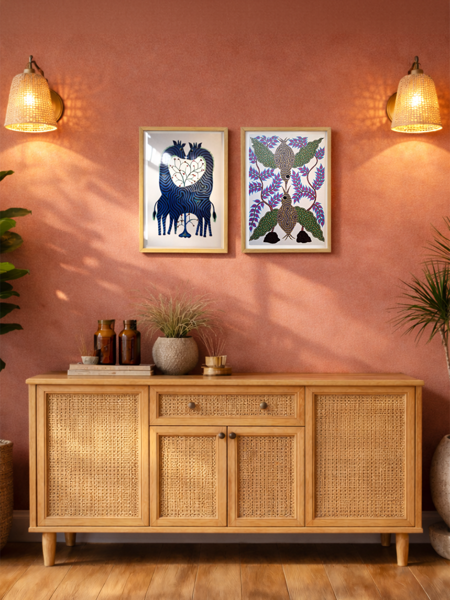 Add a vibrant touch of tribal storytelling to your space with this exquisite set of Bhil paintings by Kamlesh Parmar. Originating from the indigenous communities of Madhya Pradesh and Gujarat, Bhil art is known for its distinctive dot technique, where intricate patterns come together to form expressive compositions. Each artwork reflects themes of nature, folklore, and everyday life, brought to life through bold colors and rhythmic detailing. Handcrafted with care, this set adds energy, culture, and artistic depth to any wall.