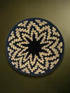 The artwork features a high-contrast monochrome aesthetic, achieved by weaving the natural, pale grass with bold, black-dyed fibre. The central design is a powerful, highly stylized flower within a flower, created using a meticulous coiling technique. This radiating floral motif holds deep symbolic weight in Indian folk art, often representing purity, divine beauty, and creation.