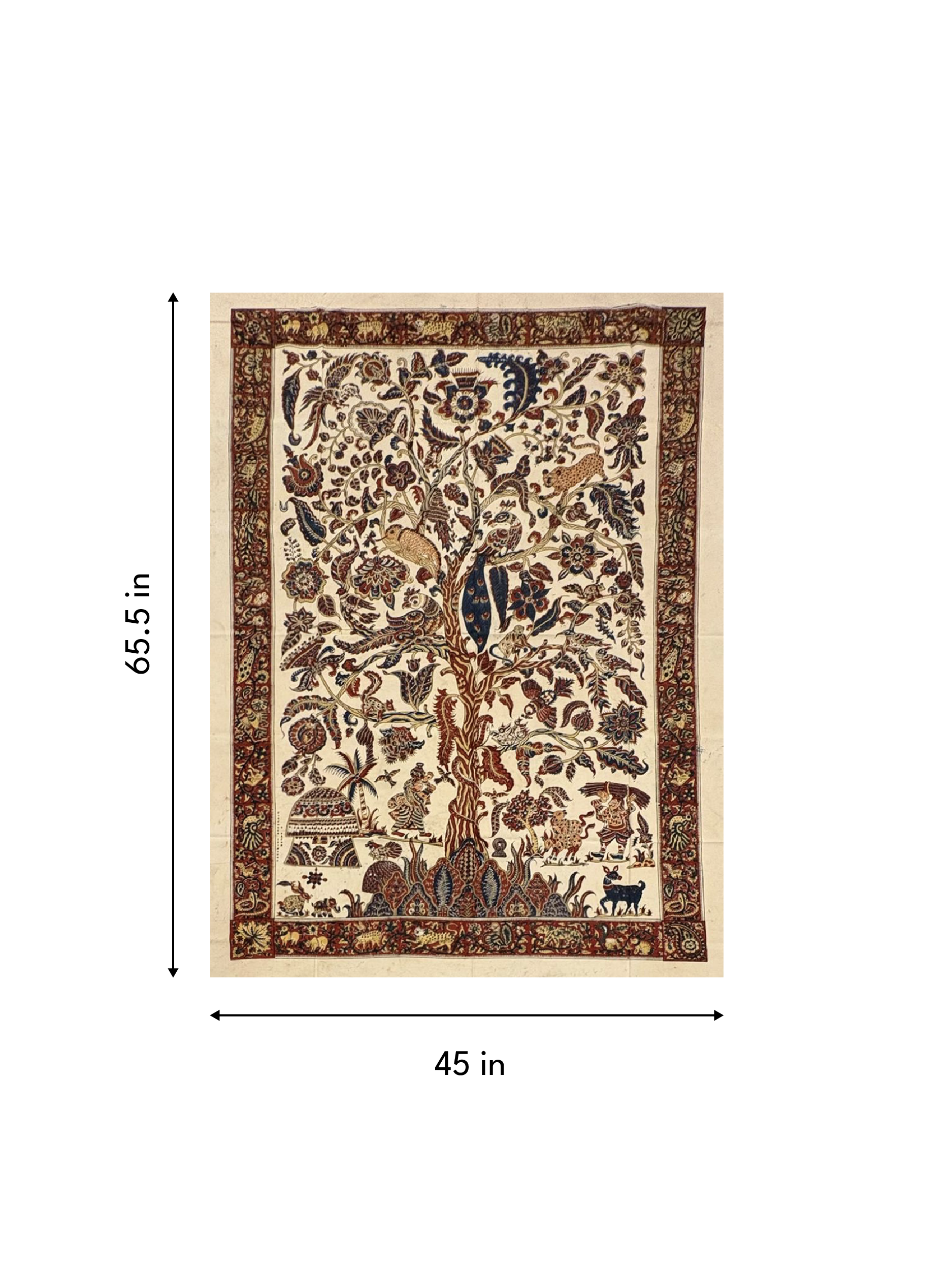 This specific artwork powerfully visualizes the theme of vitality, cosmic unity, and the cyclical nature of existence, dominating the central field with a majestic, vertically oriented Tree of Life. Its sweeping branches connect all life forms, and the color palette adheres strictly to the classic Machilipatnam tradition, featuring striking reds (from madder root) and deep blues/indigo set against the natural cream of the cotton cloth, creating a dense, highly detailed pattern typical of the technique.