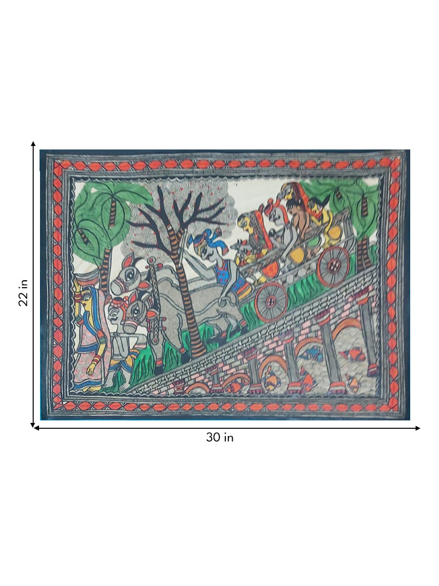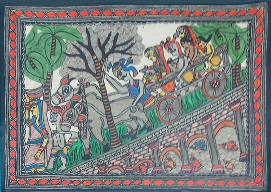 This Madhubani painting by artist Priti Karn captures a bustling and rhythmic Village Scene, illustrating a traditional journey through a rural landscape. The composition is divided diagonally by a brick-patterned bridge or elevated path, upon which a large bullock cart carries several villagers. The cart is pulled by a pair of sturdy, grey-toned bulls, led by a driver holding a guiding stick. Inside the cart, a group of men and women are depicted with the classic large, almond-shaped eyes and sharp profiles typical of the Mithila tradition, their colorful attire adding a sense of festivity to the migration.