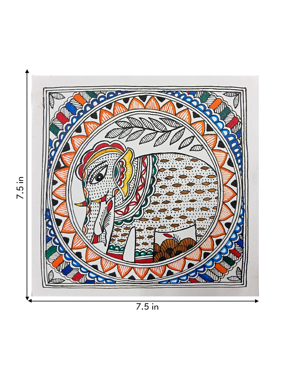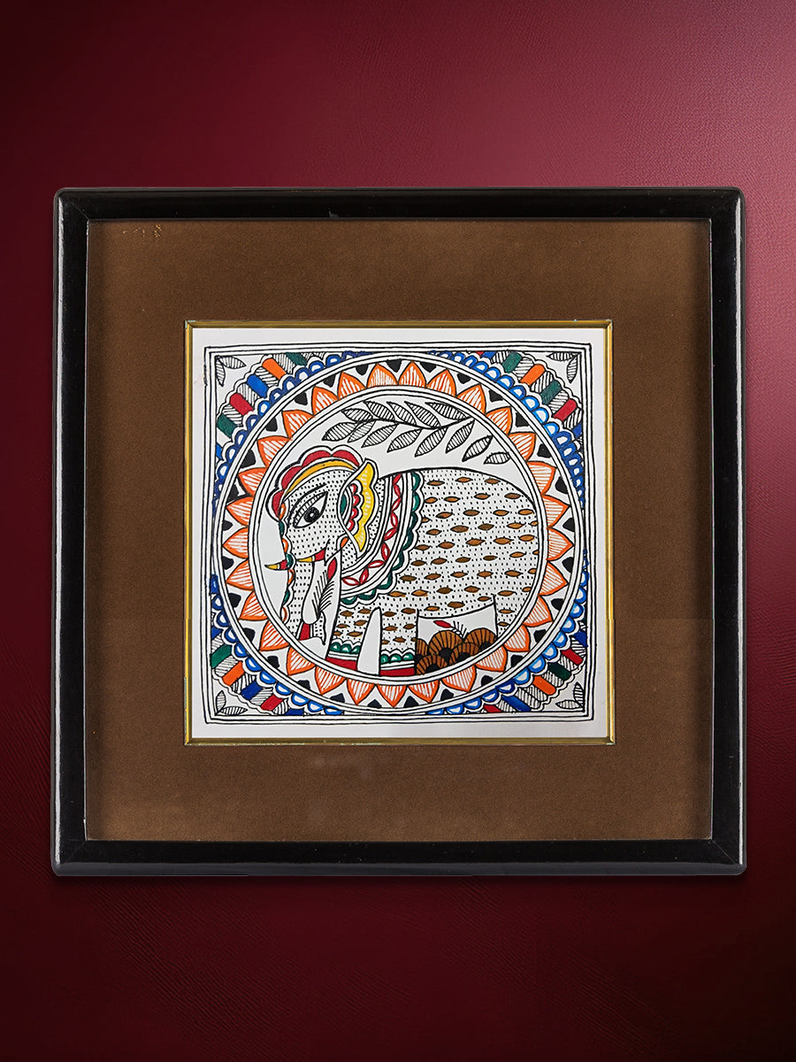 The entire circular motif is set within a square border, with small floral accents in the corners to transition the geometric shapes. This piece is a masterful blend of Bharni color-filling and Kachni line-work, using a palette of indigo, orange, and forest green. The use of the circle suggests that this specific depiction may represent a mandala, intended for both decorative beauty and spiritual focus.