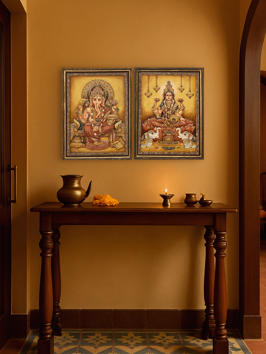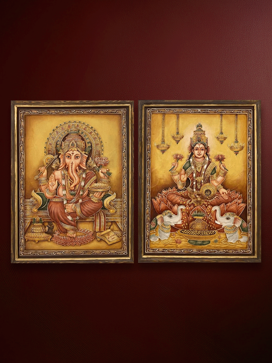 This magnificent set of two devotional artworks by master artist Amita Sachdeva captures the ultimate divine partnership of Lord Ganesha and Goddess Lakshmi (Gajalakshmi). Revered as the deities of wisdom, protection, abundance, and prosperity, this pair is a source of complete spiritual harmony. Both pieces are brought to life through the high-relief Stone Dust medium, which uses powdered marble to create a striking, embossed texture and a luxurious palette of ochres and gold.